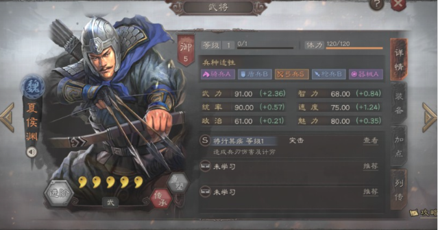 夏侯渊的智力和速度还可以,武力、统率、魅力都比较高,政治就比较一般,他旗下的骑兵和弓兵都是S级别,器械擅长是A级别,但是盾兵和枪兵就只有B了。