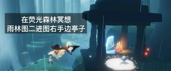 完成攻略:荧光森林冥想点在雨林二图右手边的亭子里,在光圈中坐下冥想并回答问题即可完成。