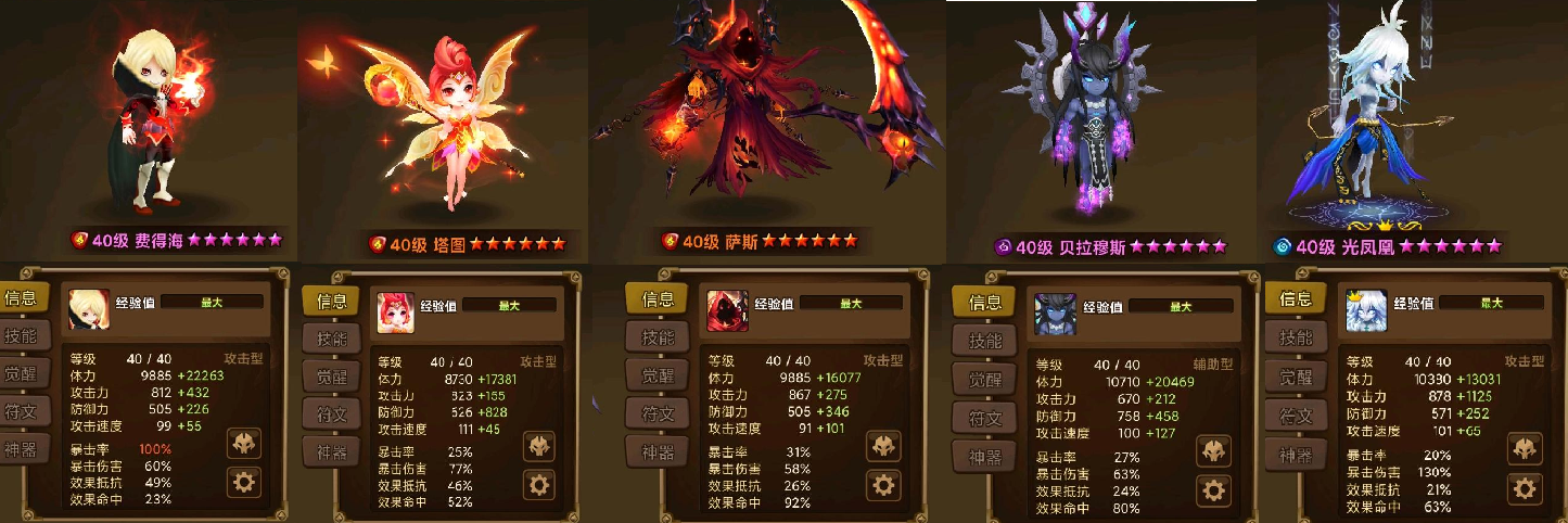 此阵容只适用于符文匮乏的新手,平均挂机时间4:30-5:20一把,清空了邮箱体力,买了四五次体,外加3000小心心换的体力,至今没翻过,而且没出现过减员,血量最低的一次大约还剩四分之一血。
