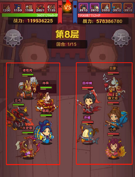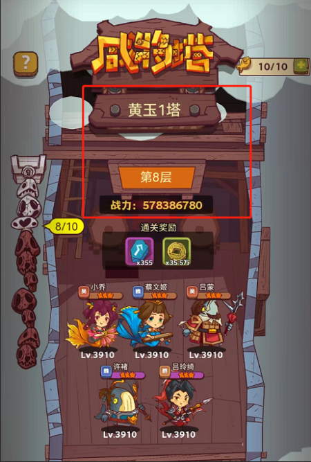 61-8守关阵容:许褚+吕玲绮+许褚+吕蒙+蔡文姬;敌方阵容英雄均达到了3910级,整体战力高达5.78亿+,蔡文姬的超强辅助还是让关卡有点难度,所以过关时使用的英雄等级越高越好,战力最低也要1.2亿。