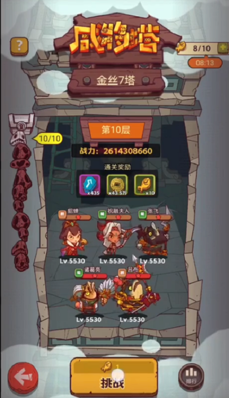 咸鱼之王77-10守塔阵容:吕布+诸葛亮+张飞+祝融夫人+貂蝉。整体战力达到26亿+;守关的貂蝉的减怒,还有祝融夫人的灼烧,张飞的眩晕和回血,是过关的难点!