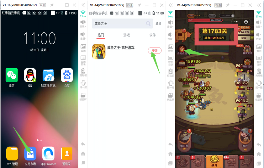 进入云手机,打开应用市场——搜索咸鱼之王,一键下载安装——登录进入游戏——