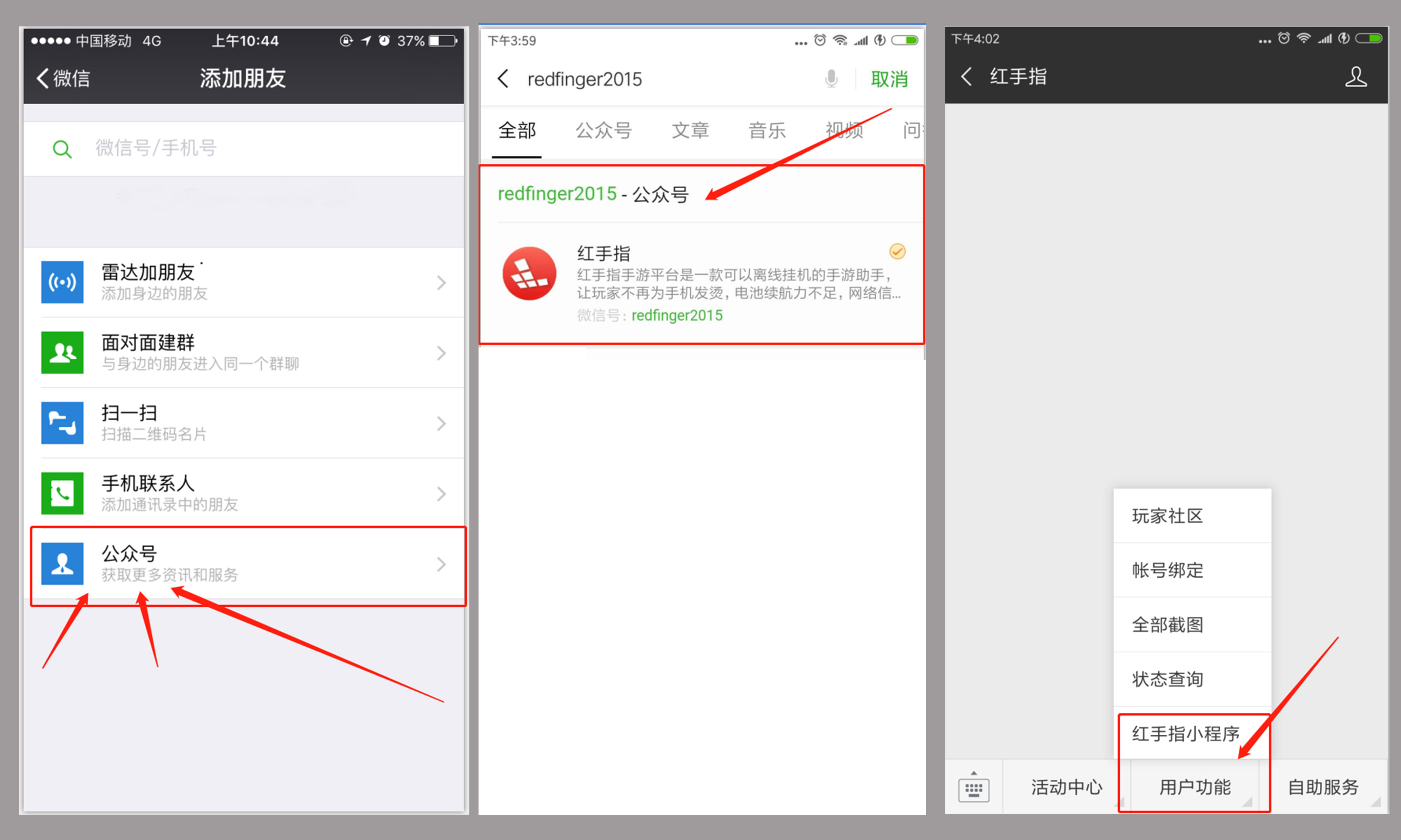 你可以通过关注“红手指游戏”公众号来绑定红手指小程序,进行账号同步。