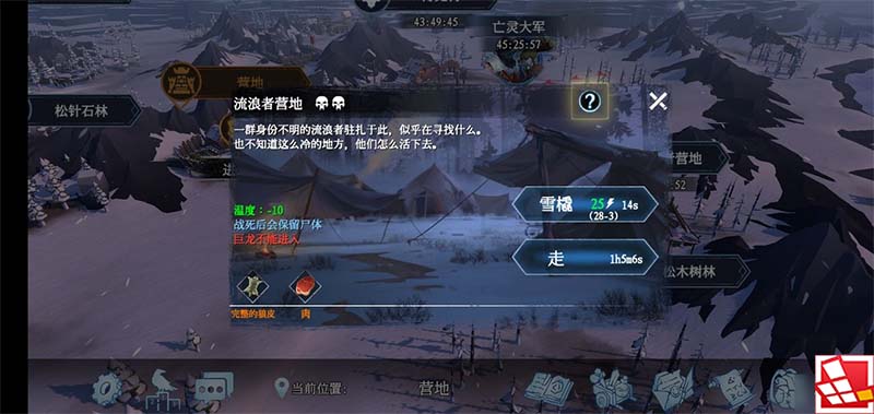 2、【流浪者营地】,注意饥饿与口渴,怪物有鹿、冰原灰狼、亡灵监工。