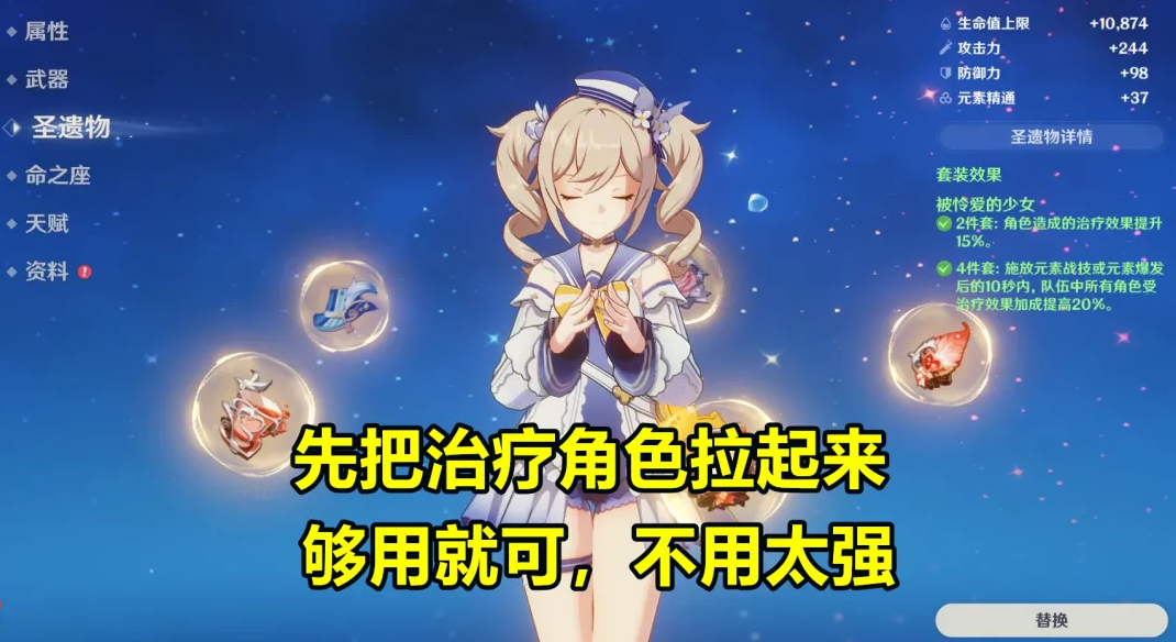 治疗角色不需要有太高的练度,前期升到60级足够了,圣遗物用“少女4件套”,以后可以把七七的圣遗物换成“千岩4件套”,芭芭拉的圣遗物选生命值沙漏、生命值杯子、治疗加成帽子,七七选攻击力沙漏、攻击力杯子、治疗加成帽子。