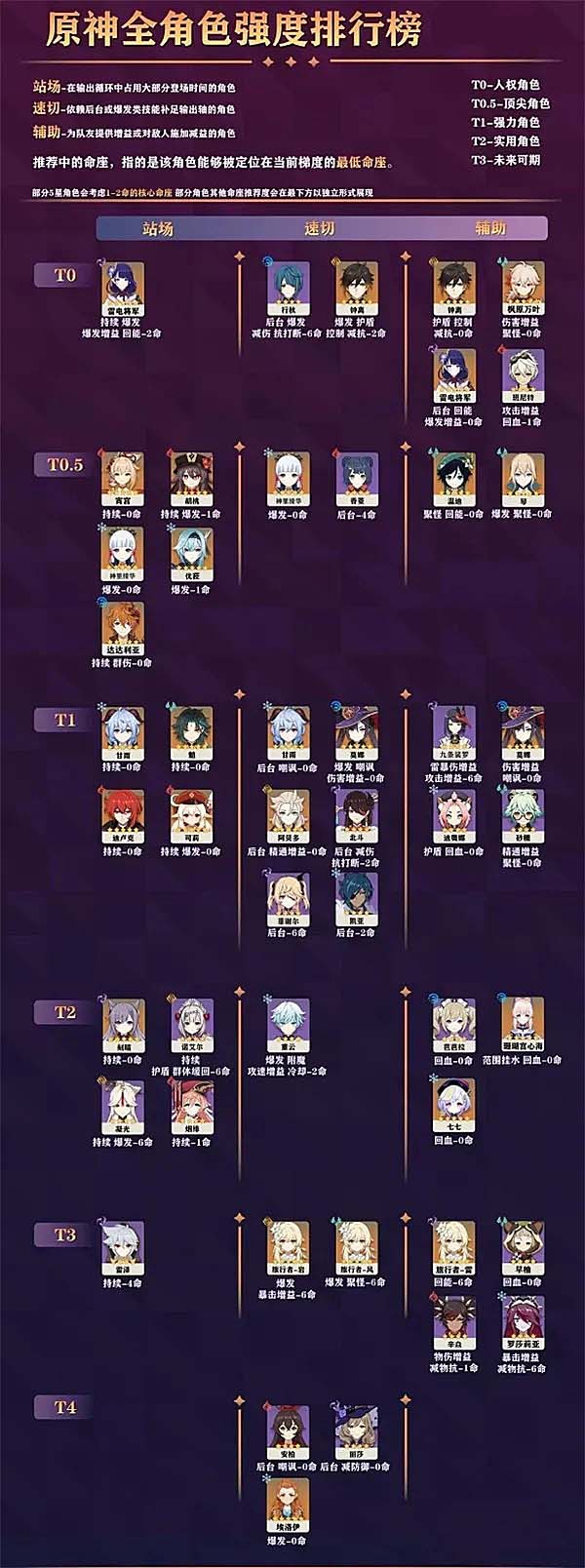 T4:七七、芭芭拉、安伯、猫猫、丽莎、风主、岩主、辛炎、砂糖、女仆(强度对命座练度要求高)