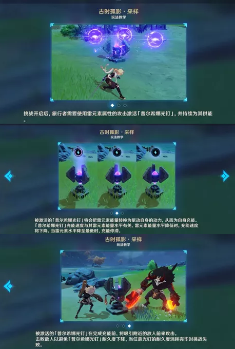 01:核心玩法机关为普尔希娜光钉,普尔希娜光钉需要使用雷元素攻击才能充能