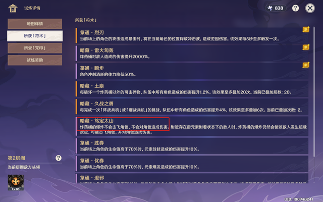 已经获得的符术可以在左上角处查看,不过符术相关的buff层数是看不到了,只能靠感觉。另外由于该试炼里火药桶会时常遇到,如果有抽到减免火药桶爆炸伤害的符术一定要优先选择。