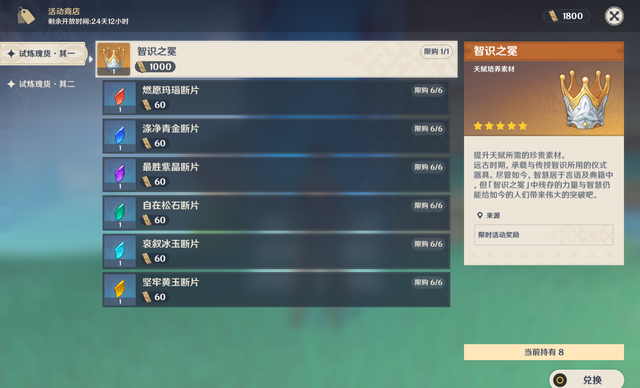 活动商店:智知之冕放在最顶上,第一天打完就能换,然后原石需要等5天,其他的碎片还有技能书搬空就好。
