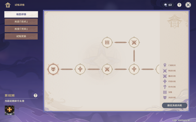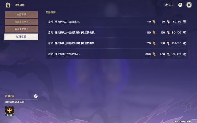 试炼奖励:在进入试炼之后,先看一眼试炼奖励很重要,免得回头还要打,这次第一关需要注意的是“真剑”与“极意”难度需要至少各打1个,如果在第一遍打时全打了极意,可能导致回来又打了次真剑然后结束探索。