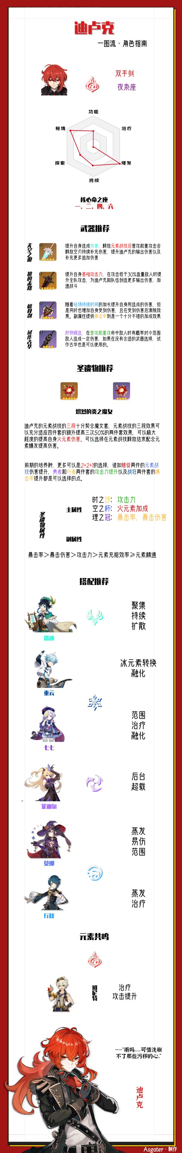 迪卢克极高的爆发输出以及自身火元素属性可以配合多种元素战胜增幅(蒸发、融化)和剧变(超载、火扩散)两种类型反应,自身元素优势和自身机制爆发优势。