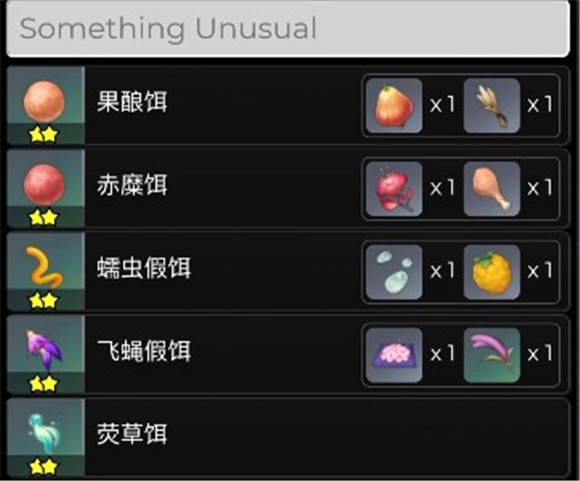 1、目前2.1版本上线了5种鱼饵,分别是果酿饵、赤糜饵、蠕虫假饵、飞蝇假饵以及荧草饵。
