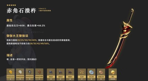属性:基础攻击+46,暴击伤害+14.4%(1级);基础攻击+608,暴击伤害+66.2%(90级)