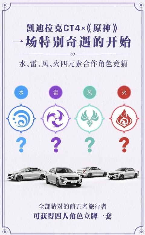 分别持有水、雷、风、火神之眼的四位神秘角色将与凯迪拉克CT4—起带你奔赴属于你的冒险之旅。
