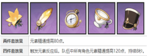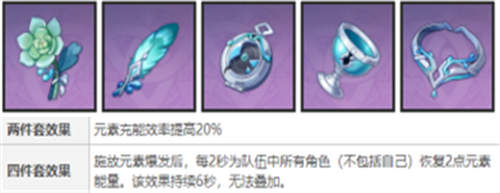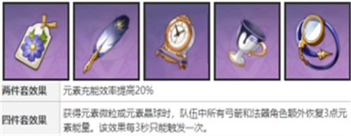 学士四件套:2件套提高自身的充能,4件套获得能量给弓箭和法器角色充能。