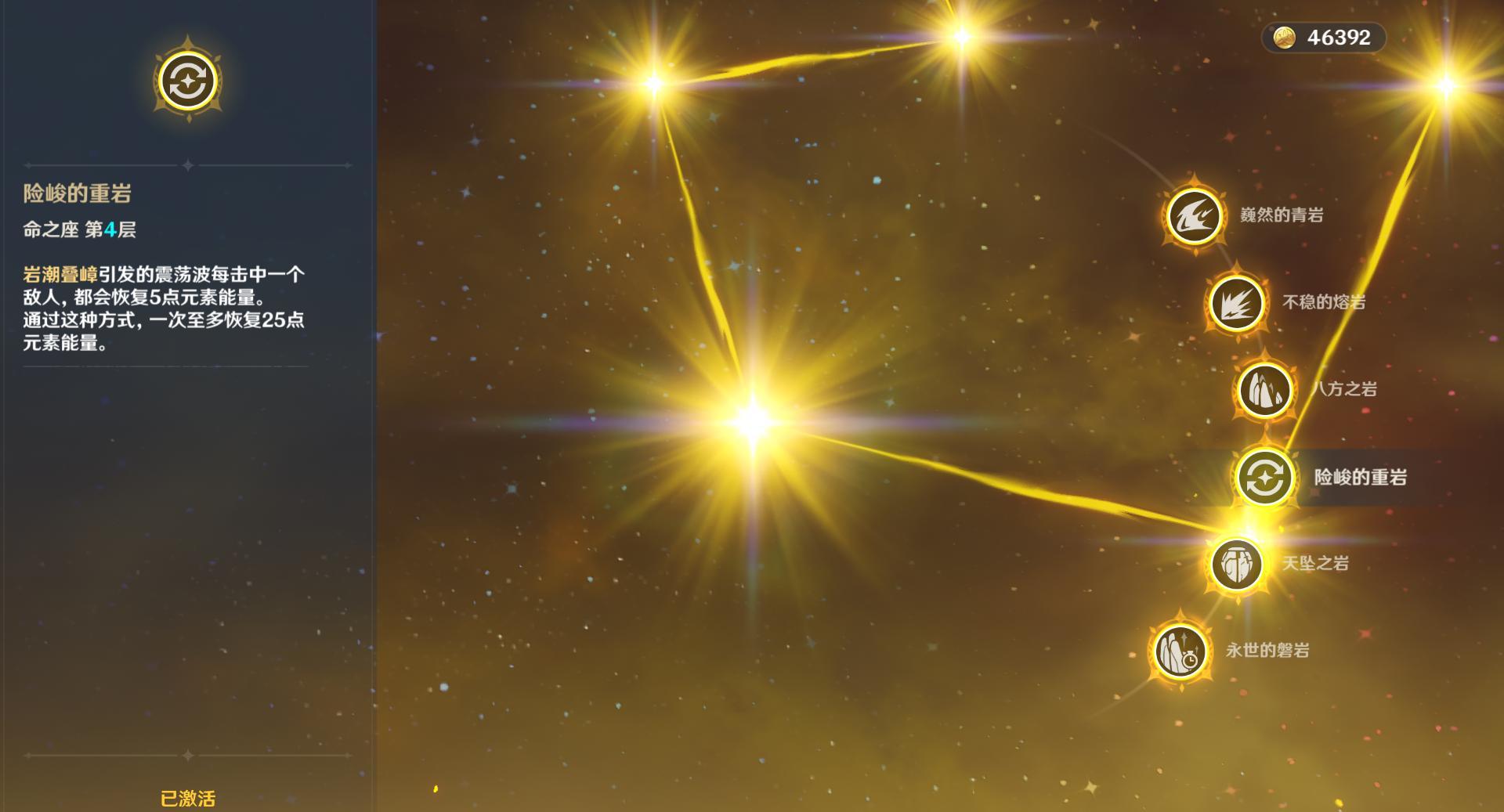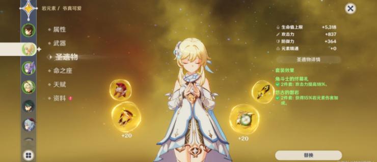 5、圣遗物方面前期推荐2战狂和2角斗士,比较容易获得,到了后期可以选择2悠谷的磐岩和2角斗士,生之花和死之羽是固定属性,时之沙选择百分比攻击力,空之杯选择岩元素伤害加成,理之冠可以选择暴击率或者暴击伤害。