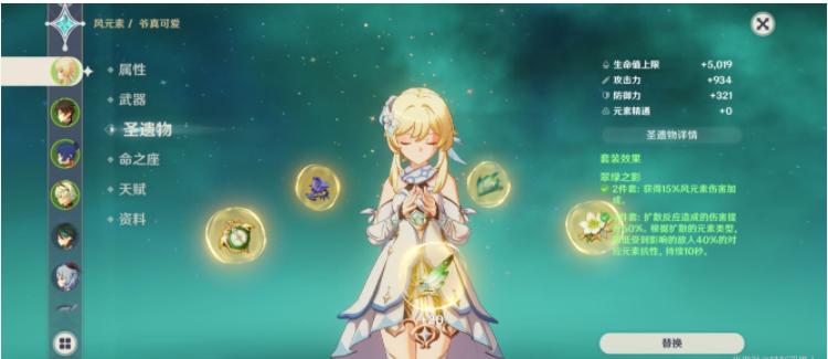 3、圣遗物方面最优解肯定是风套四件,非常全能,四件效果增加的扩散伤害和减抗性是可以吃满的,下位选择是宗室四件,可以增加大招伤害和群体增伤,大招作为脱手的多段伤害技能对中小型敌人是必杀的。