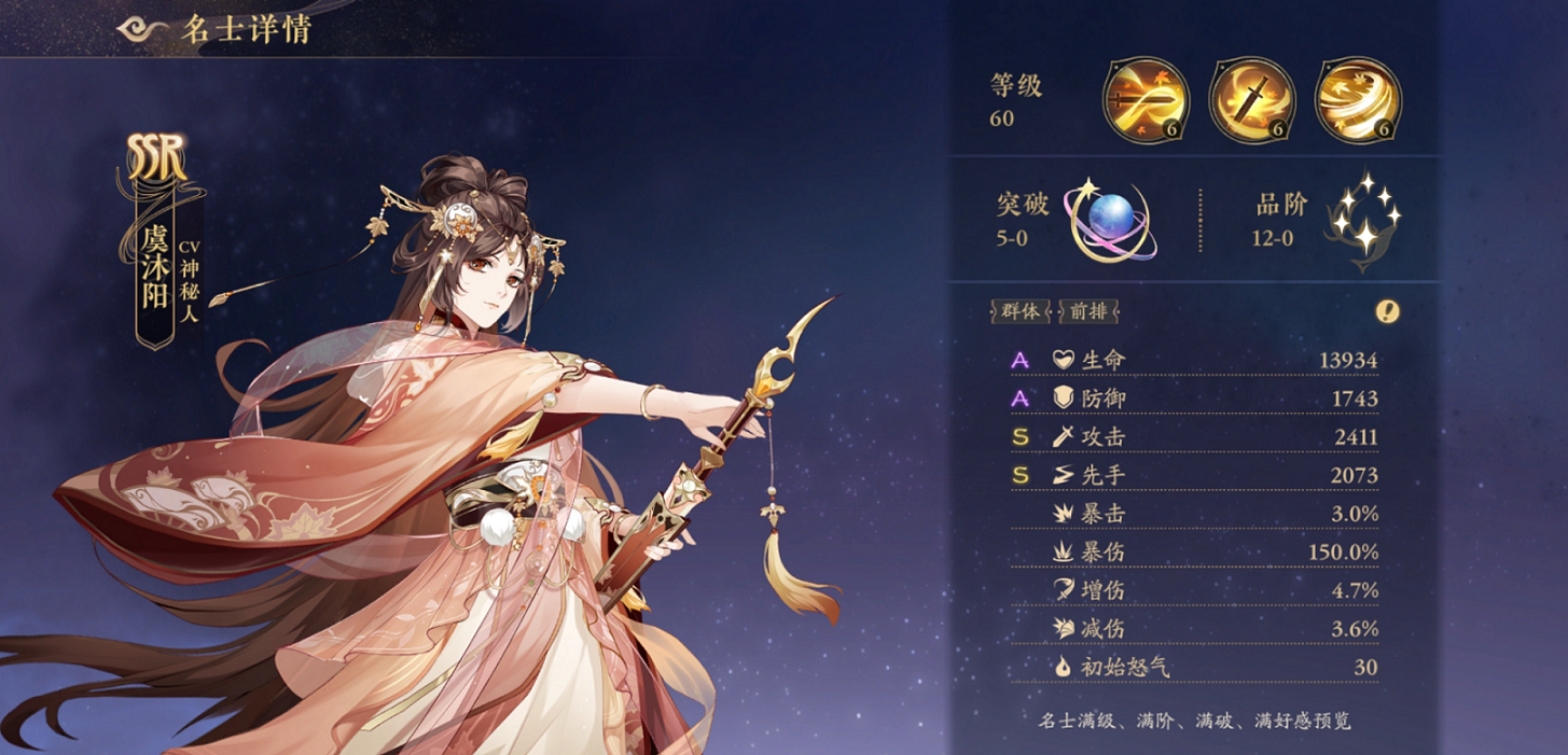 在实战中,目前前期大家都喜欢用暴力过关的方法,因此虞沐阳会是大家非常好的搭档,高额的攻击、优秀的反击、10%概率的加血,3次攻击队友,是一名以攻代守的优秀前排战士,强度在T1左右。