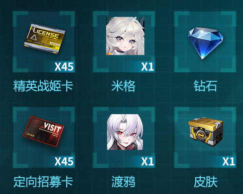 首次七天登录赠送:精英战姬【米格】*1+定向招募卡*10