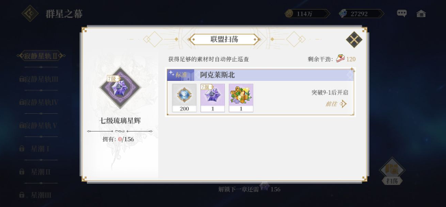 群星的点亮消耗不同等级的琉璃星辉,冒险章节越靠后,产出的琉璃星辉等级越高。群星之幕等级会限制关卡开启的进度。所以有体力就把群星点满(根据关卡的产出情况,尽量点到高级材料无法产出)。