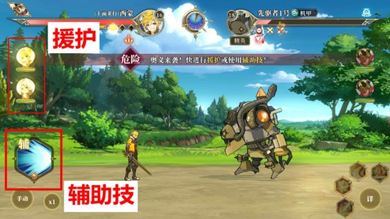 都需要在敌方出手回合消耗奥义点才可使用,激活后需要等到对方当前技能结束才会生效,所以需要提前释放才可打断或抵抗对方技能。援护是进行换人打断BOSS技能,辅助技是减少伤害、回血或者反击为主,都有CD,无法连续释放。