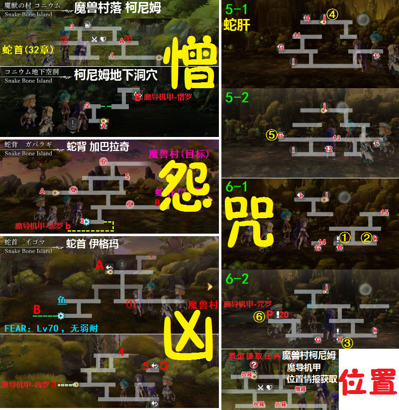 ③凶罗:从魔兽村左侧前往蛇首,打左下FEAR,从其后面隐藏道路进入另一地图,最左边有隐藏道路。