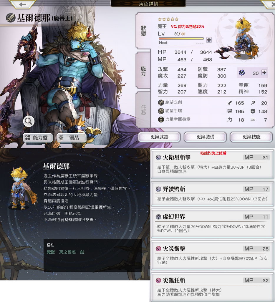 ①每回合行动前会将上回合受到的DEBUFF和异常状态返还给我方全体,地水火风属耐DOWN会返还全属耐DOWN,斩突打DOWN会返还物耐DOWN