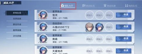 4、进入大厅之后可以看到房间了,点击申请就可以申请加入队伍。