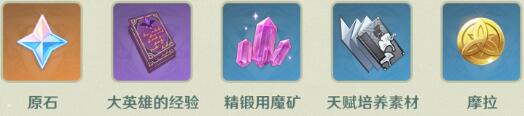 原神玩家完成活动各项试炼任务,可获得原石、大英雄的经验、精锻用魔矿、天赋培养素材、摩拉等奖励。