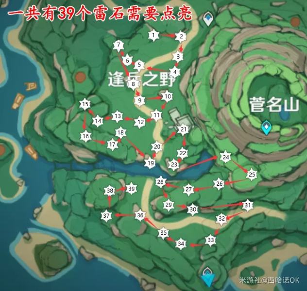 在逢岳之野,与(知世)对话,需要点亮(两个传送点之间的全部雷石),点亮后再回来与知世对话,任务完成,如图2,一共需要点亮39个雷石,(4号、15号、27号)这三处需要对附近的雷鸟雕像用羽毛,才会出现雷石。
