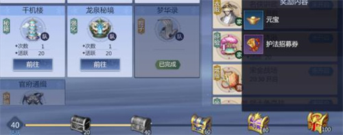 我个人建议是自己创建一个队伍(自己当队长有额外的队长宝箱奖励)在世界上找人打一条龙就行,游戏的UI设计的还是不错的会挂机进行下一个副本。队长稍微操作一下就行【千机楼】+【龙泉秘境】+【梦华录】+【官府通缉】。做完就能拿到60点活跃度。