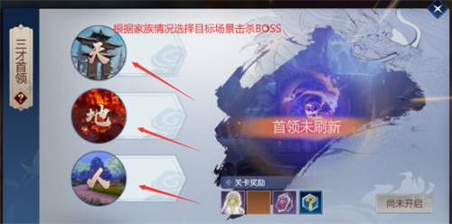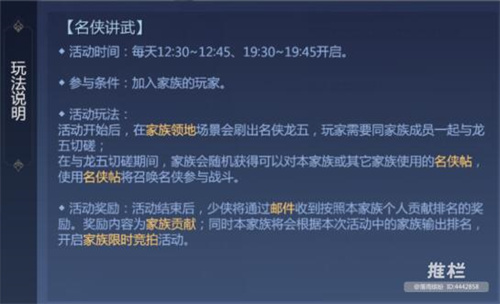然后每天两场【名侠讲武】(20活跃)12:30/19:30到家族领地烤火,12:35/19:35正式开始打boss,【三才首领】开放时间为21:30-22:00半个小时。
