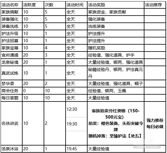 每天的限时活动【野外精英】只去打橙色/紫色的拿最好的奖励BOSS。【白虎堂】找帮会活动时间拿最好的击杀奖励。【名侠讲武】,【三才首领】,【宋金战场】一场不落下!