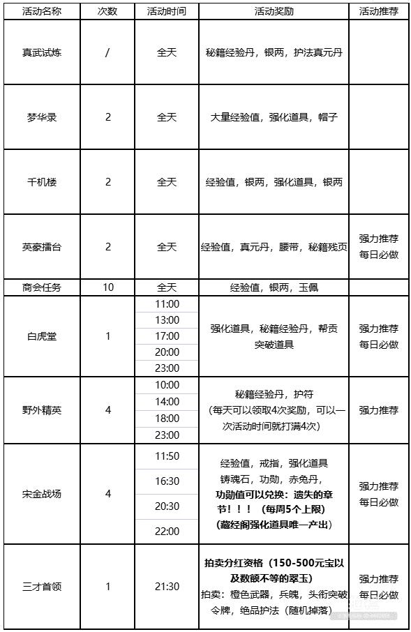 补充:个人活动如【英豪擂台】、【真武试炼】、【梦华录】、【千机楼】等活动给予的奖励都是不错的,有时间的玩家还是可以参与的,所以可以根据个人情况尽量参加。
