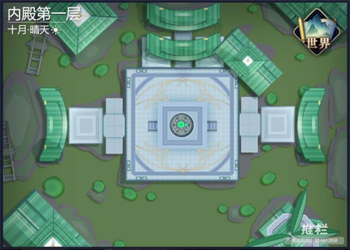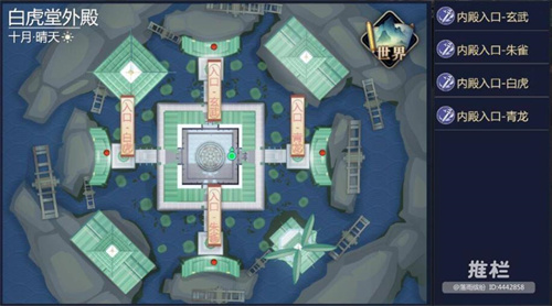 在外殿的东西南北四个方向,分别对应朱雀门、青龙门、玄武门和白虎门,每个门均可进入内殿第一层;