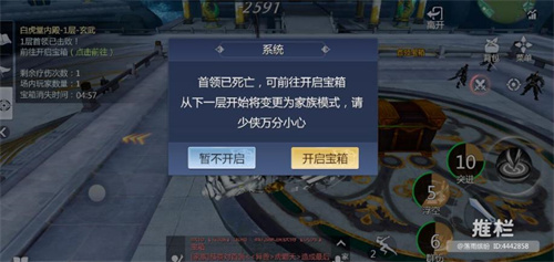 (boss被击杀后可以点击左侧去下一层,剩余疗伤次数、数量和宝箱消失时间均有显示)