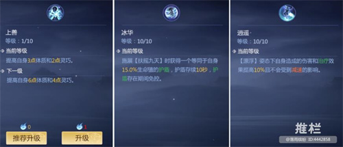 【上善】:提高生命上限和暴击几率,不建议升级。