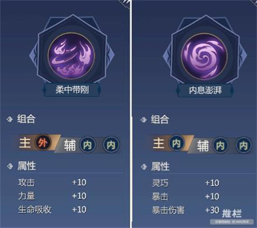 装配不同的秘籍组合可以获得不同的组合效果,建议装配【柔中带刚】,获取攻击加成和生命吸收效果,配合白麓的高伤害可以在获得输出的同时回复生命提高续航能力。