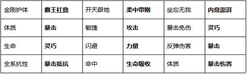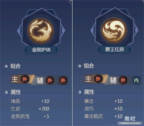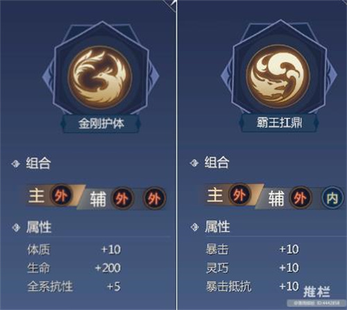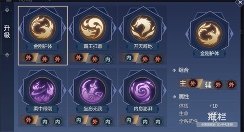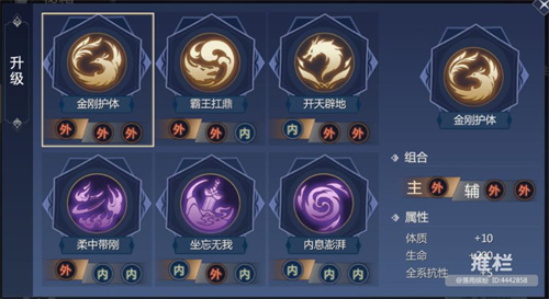根据天王前排肉盾的定位,副秘籍可以挑选增加防御属性秘籍,并组合成由三外【金刚护体】或者两外一内【霸王扛鼎】的组合,提升自身生命或者抗性。
