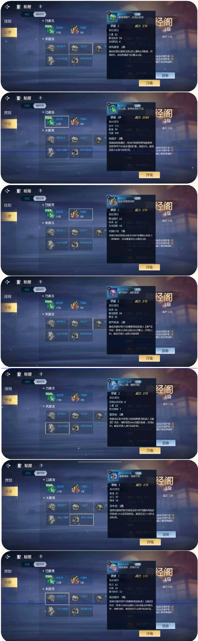 4、秘籍可通过探宝和千机阁获得,100个碎片合成一本秘籍,【注意:没开藏经阁之前,没到40级之前,不要探宝,不会出秘籍碎片】