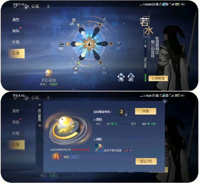 2、背包界面有个心境任务,一周5个,做完会给5个橙心卷,奇珍阁也能买。把橙心卷送给对应数值的npc。三项数值达到40,就可以买钥匙激活星盘。