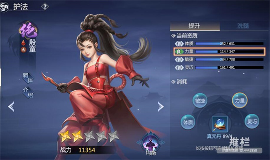 游戏中资质分为提升和洗髓两项。提升,即通过消耗真元丹提升护法基础属性,每次消耗基础属性提升20点,护法战力提升200,通过提升护法战力可以提升护法的护主技能等级。获得战力加成;洗髓,即通过消耗洗髓丹提升护法原属性上限。