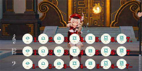 如上图,原神的风物琴分为上高音,中音、下低音3个部分;我们把它分为三行,①②③④⑤⑥⑦代表高音,1234567代表中音,❶❷❸❹❺❻❼代表低音,琴谱空格替代停顿,括号表示两个按键一起按;