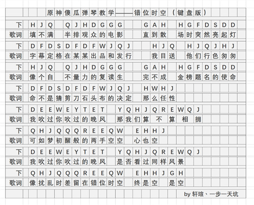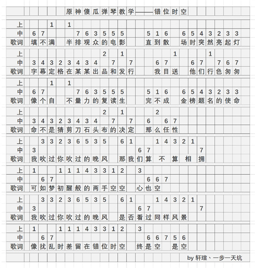 “错位时空”是周仁作词、张博文作曲、艾辰演唱的歌曲,由网易云飓风工作室制作,明年1月1日发行。在原神游戏中,玩家可以自由演奏音乐。在原神游戏中,玩家可以自由演奏音乐,其中错位时空是一首非常受欢迎的流行歌曲。这首歌于2001年1月上线,深受许多人的喜爱。一些玩家不知道这首歌的乐谱是什么。红手指小编分享原神琴谱错位时空,及按键顺序对照。