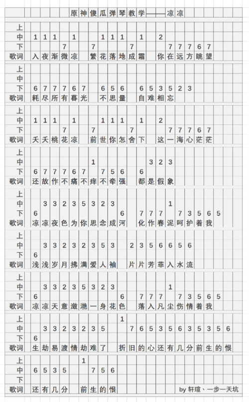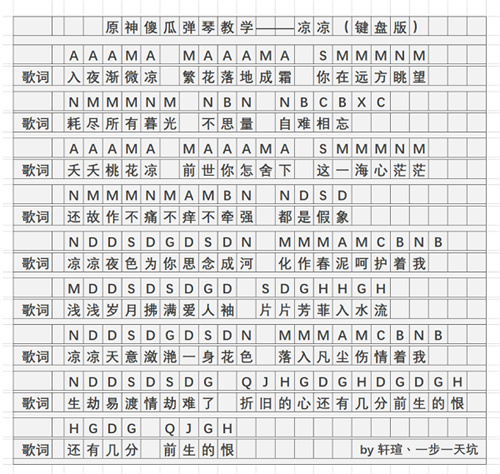 凉凉是电视连续剧《三生三世十里桃花》的片尾曲,由刘畅作曲,谭旋作曲,张碧晨,杨宗纬演唱,收录在2017年2月18日发行的专辑《三生三世十里桃花》。在原神游戏中,玩家可以自由演奏音乐,其中凉凉是一首非常好听的古歌,也是电视剧《三生三世十里桃花》的片尾曲。有些玩家不知道这首歌的乐谱是什么。红手指小编分享原神琴谱若凉凉,及按键顺序对照。