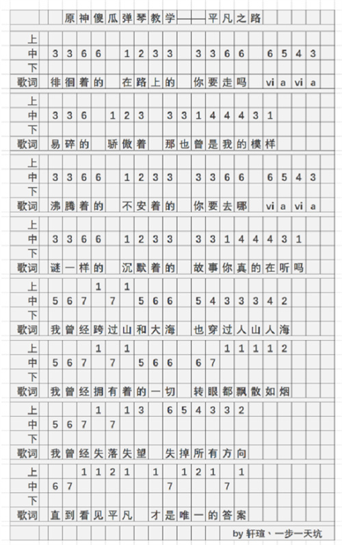《平凡之路》是朴树作曲、朴树、韩寒作词、朴树编曲演唱的歌曲,于2014年7月16日首映。这首歌是电影《后会无期》的主题曲,收录在朴树2017年4月30日发行的专辑《猎户星座》中。在原神游戏中,玩家可以自由演奏歌曲,其平凡之路是朴树演唱的流行歌曲,也是电影《后会无期》的主题曲。有些玩家不知道这首歌的乐谱是什么。红手指小编分享原神琴谱平凡之路,及按键顺序对照。