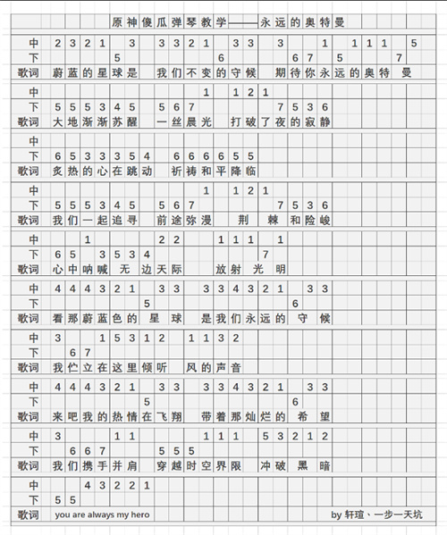 《永远的奥特曼》是《迪迦奥特曼》的中文片尾曲。作词和作曲是齐放,编曲是安栋,制作是缪森,演唱是LINE,发行于2012年01月01日。原神游戏中玩家是可以自由演奏歌曲的,其中永远的奥特曼是迪迦奥特曼中文版的片尾曲,这首歌还是非常经典的,有玩家不知道该歌曲的琴谱是什么。红手指小编分享原神琴谱永远的奥特曼,及按键顺序对照。