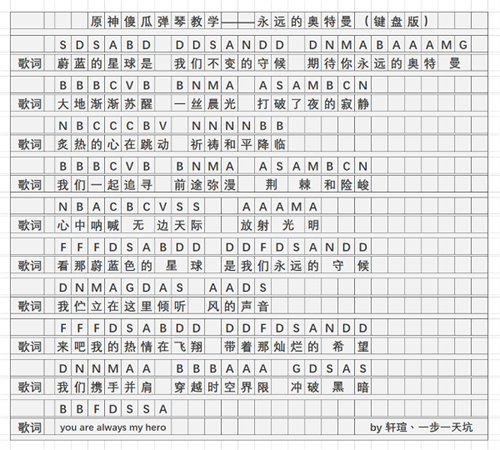 Ps:琴谱中的上中下就是游戏中三行高音、中音、低音按键,键盘就是26键字母,玩家按照对应的弹奏即可。