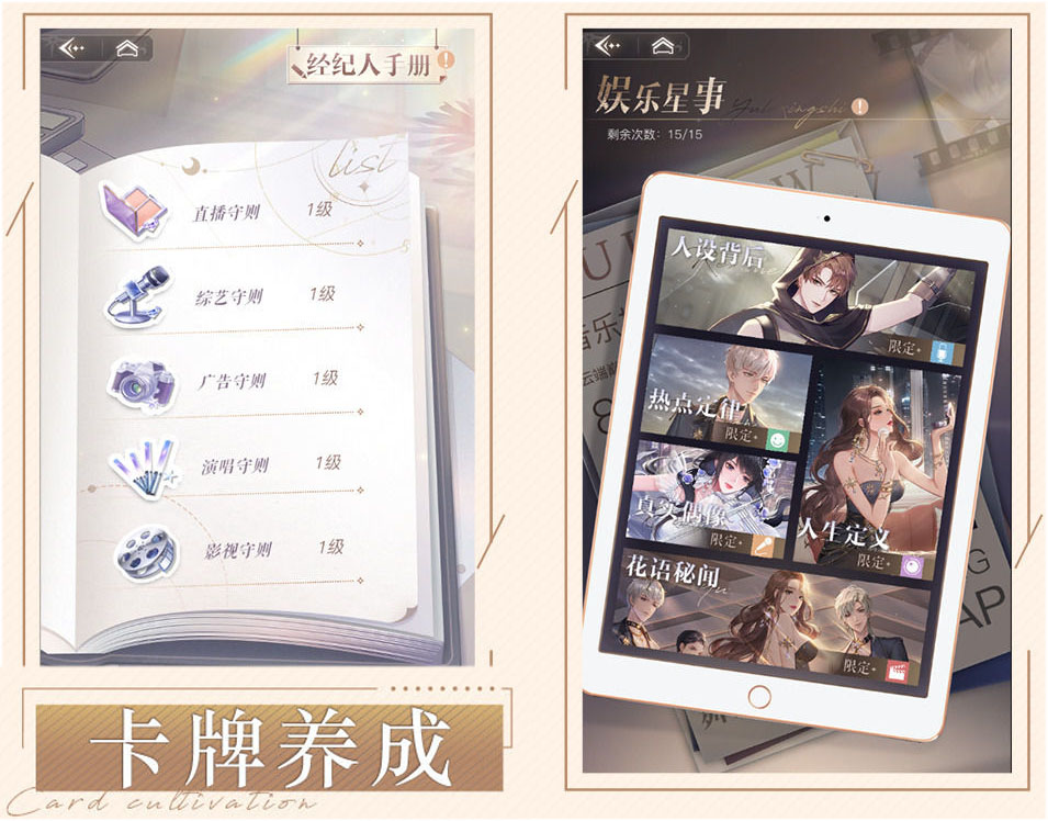 《璀璨星途》是由畅游聚变工作室研发、腾讯发行的娱乐女性向手机游戏。玩家在游戏中扮演经纪人,签约7位不同领域、不同个性的艺术家,见证他们的成长。璀璨星途游戏中有卡牌,针对卡牌玩家有不同的玩法,下面红手指小编整理璀璨星途卡牌养成玩法攻略,璀璨星途养成类型有哪些内容!