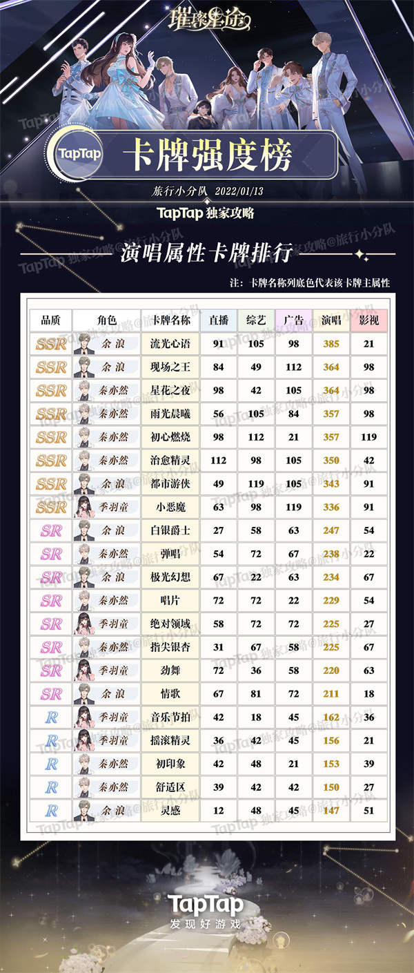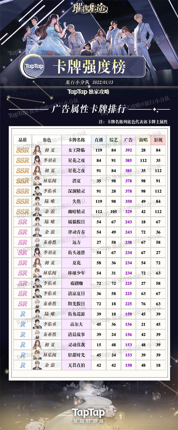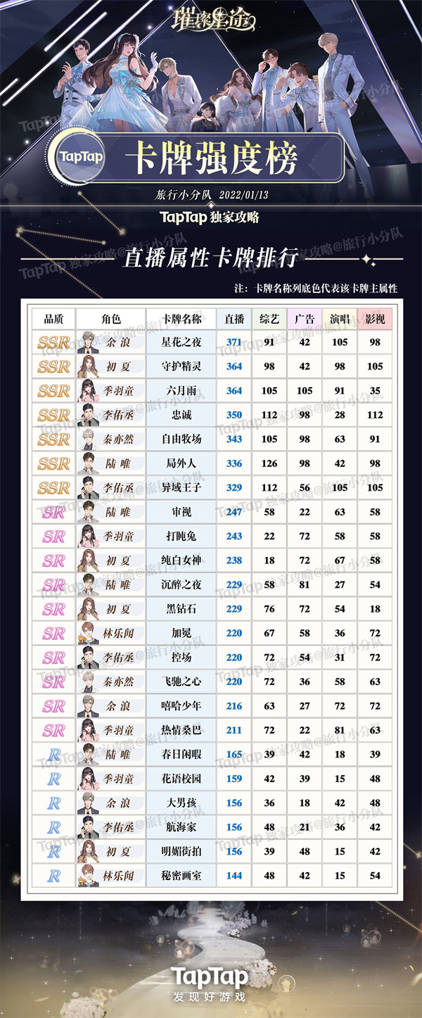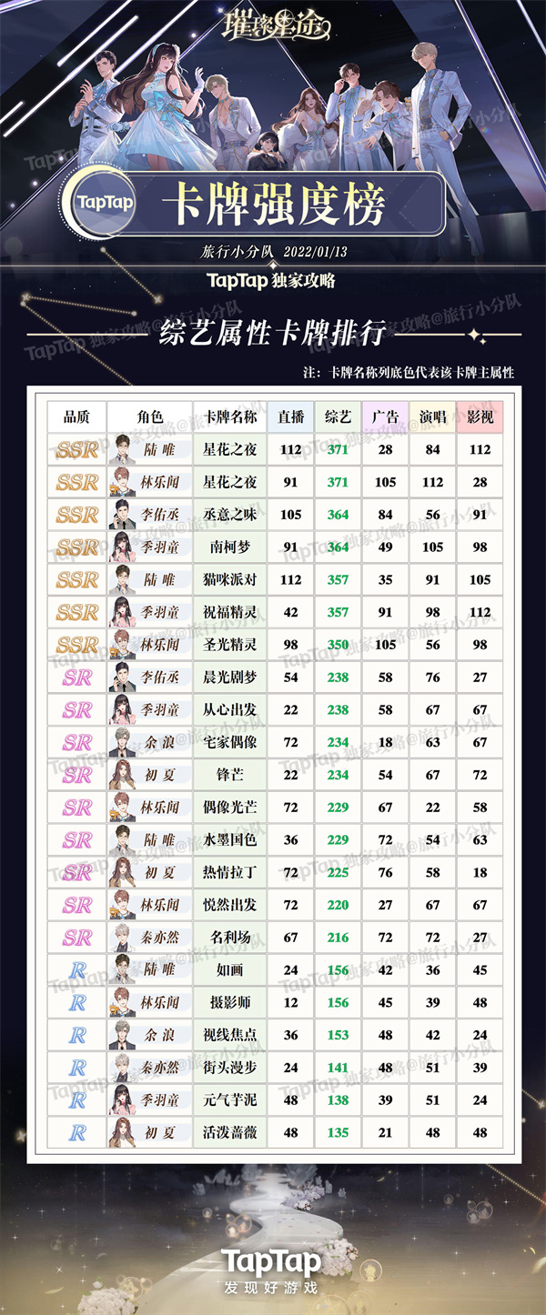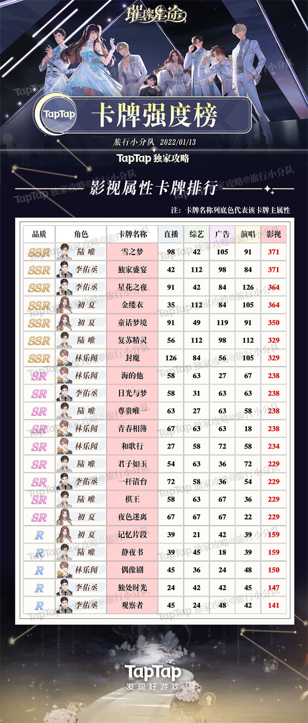 《璀璨星途》卡共有五个属性,品质分为SSR、SR、R三种属性,不需要技能,可以根据质量的高低和所需的属性养,并记得养能升华的高品质卡。可以先养升华更多的SR,常驻SR可以等重复SSR升华后再养。记得给主卡进化,进化可以带来很多属性加成!微氪玩家注意不要养氪,因为很难升华。接下来小编整理璀璨星途卡牌强度排行榜,5种属性各自卡牌强度榜: